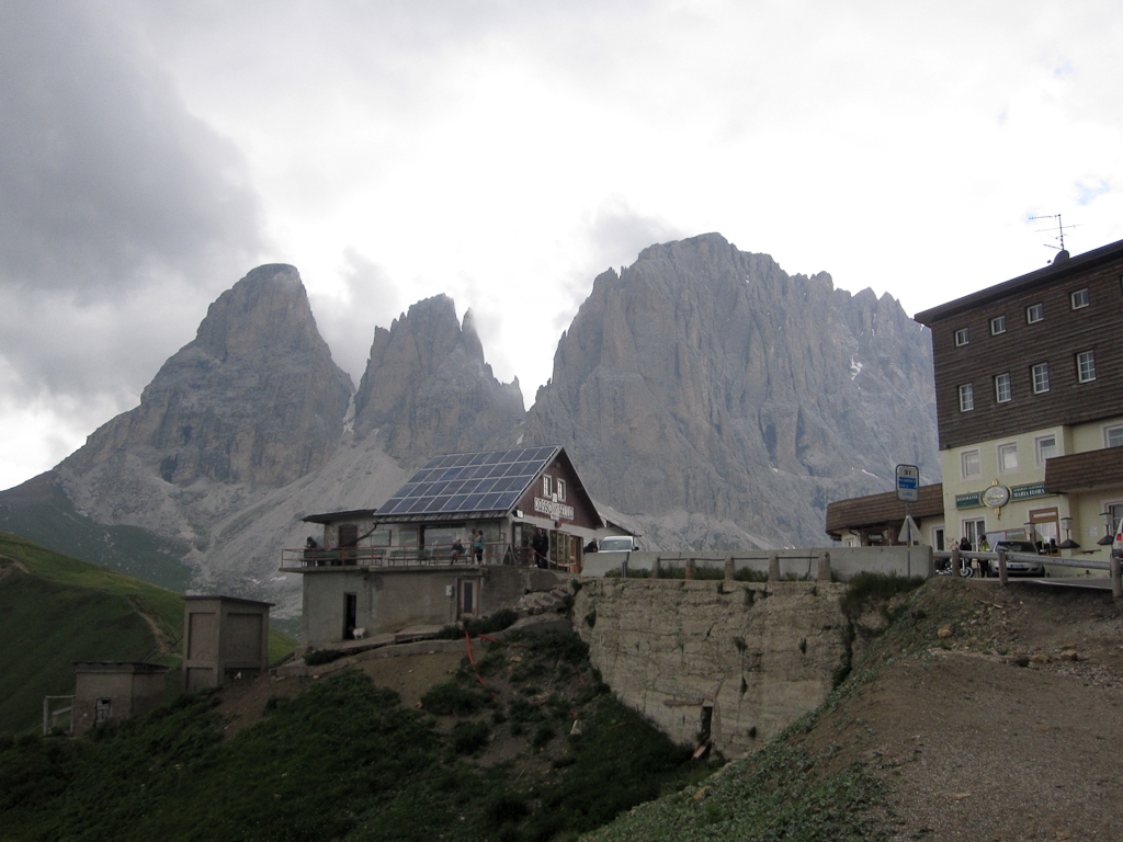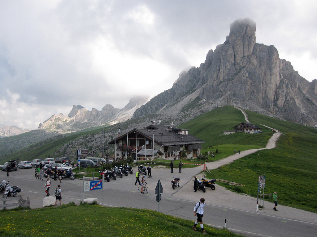 Počasí bylo v téhle chvíli docela slušné, i když už se začínaly honit mraky. Po sjezdu z Paso Di Vaprparola jsme obědvali v malé restauraci u silnice (N46 33.258 E11 58.036). K obědu jsme zasedli ještě venku, ale po chvíli nás déšť zahnal pod střechu a posléze dovnitř restaurace. Přestalo pršet a my pokračovali v cestě směrem na San Cassiano. Tenhle úsek cesty byl celkem nudný, spousta plížících se aut s italskými důchodci a tak jsme byli rádi, když jsme mohli vypadnout v Corvara in Badia směrem na Paso Gardena.