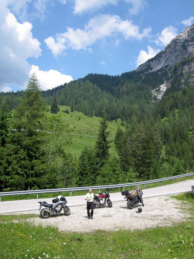 Lehké komplikace nastaly odpoledne, kdy jsem začal zápasit s navigací. Ta si trošku dělala co chtěla, takže kolem Spittal An Der Drau jsme lehce kufrovali, ale nakonec se nám podařilo vrátit na trasu. Dál cesta ubíhala v pohodě, jen závěr nám úplně nevyšel. Pár desítek kilometrů před cílem začaly padat velké kapky a nakonec z toho byla velká bouřka, která nás opustila až těsně před příjezdem do Cortiny. Cesta z Dobiacco Nuovo je v mizerném stavu, ale je to nejkratší trasa, navíc přes první průsmyk. V Cortině už byl David s bráchou Martinem takže společná večeře a na kutě v očekávání příštích dnů.